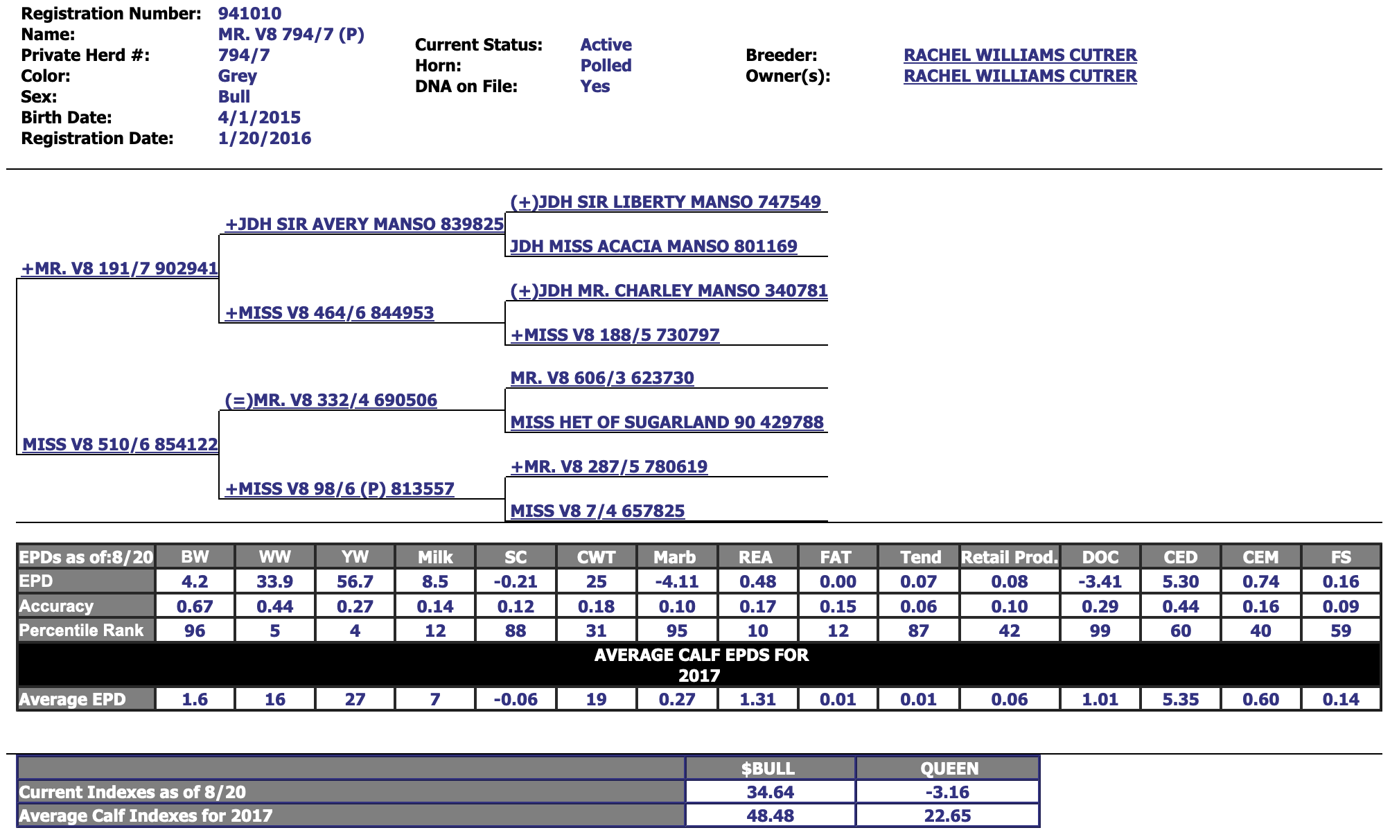 Owned by Rachel and Brandon Cutrer– Mr. V8-794/7 is one of our sources for quality Brahman genetic material.